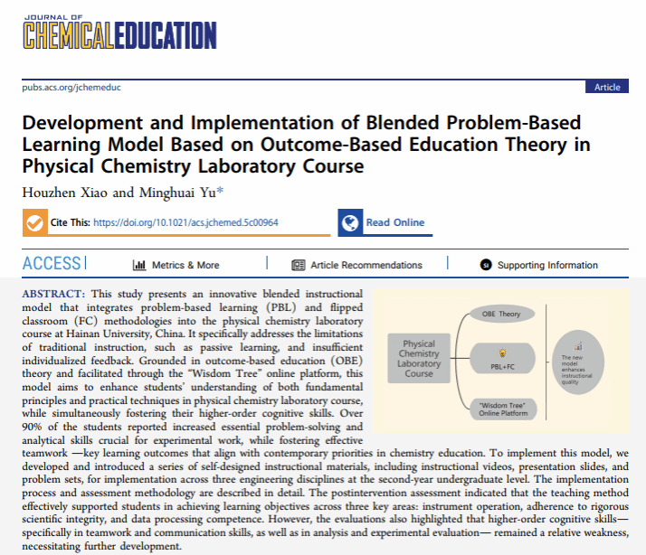 基础化学实验教学中心的重要教学研究成果“Development and Implementation of Blended Problem-Based Learning Model Based on Outcome-Based Education Theory in Physical Chemistry Laboratory Course”(J. Chem. Educ. 2026, DOI:10.1021/acs.jchemed.5c00964)在美国化学会旗下的《Journal of Chemical Education》(JCE)上发表。基础化学实验教学中心肖厚贞老师为论文第一作者, 搜同