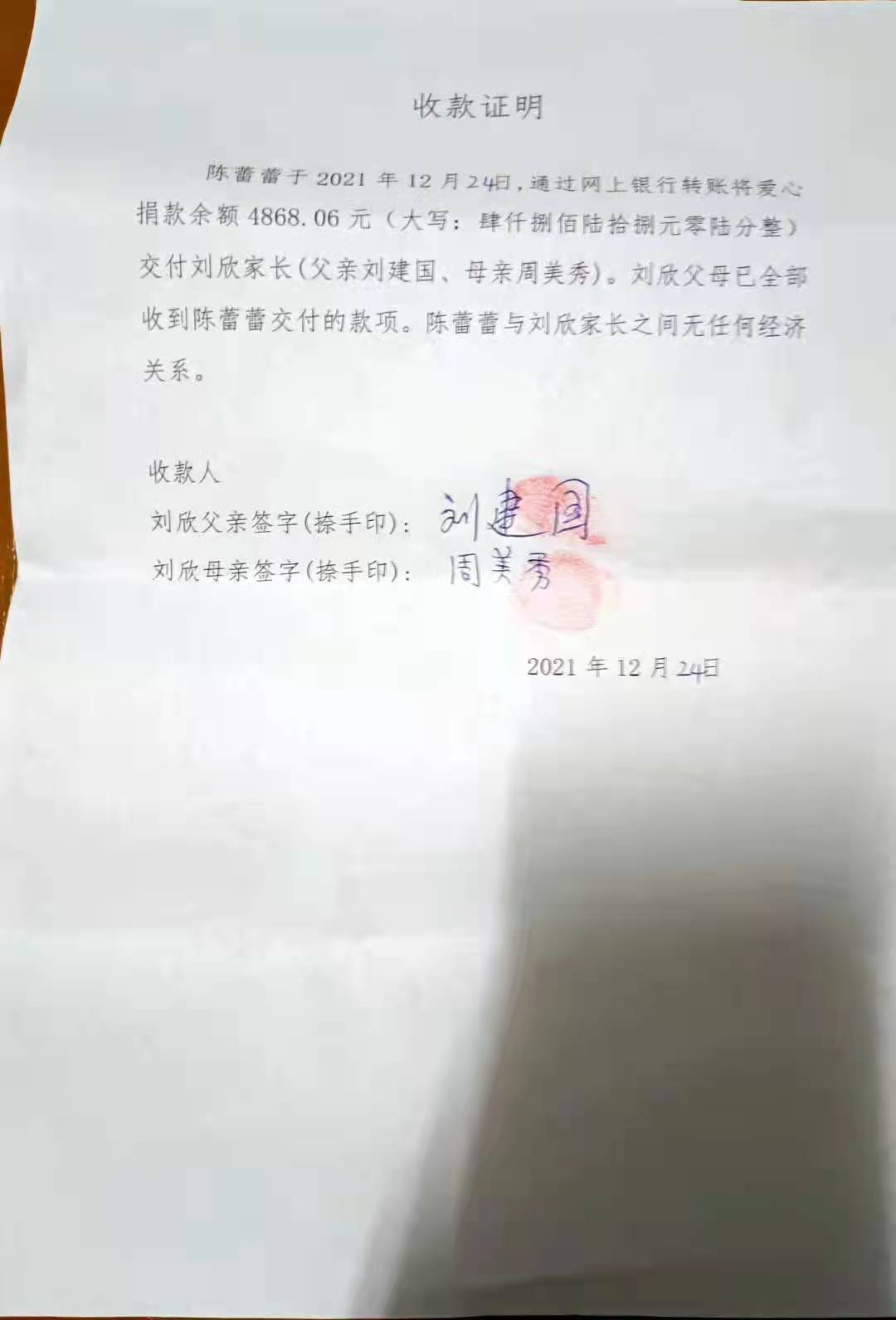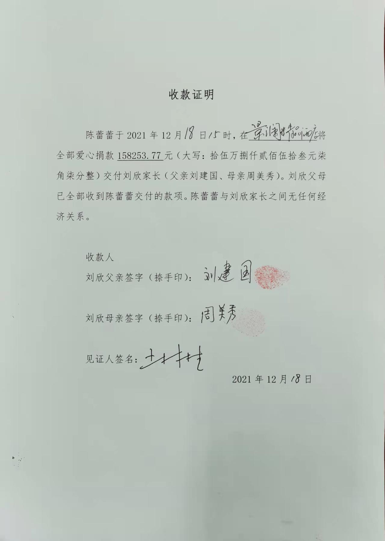 发布《关于停止接收捐款的公告》,停止接收一切捐款。截止至2021年12月18日8时,共收到158253.77元(大写:拾伍万捌仟贰佰伍拾叁元柒角柒分整)。但是之前已组织捐款的单位没有来得及将爱心捐款汇入账户,从12月18日8时至19日陆续有4868.06元(大写:肆仟捌佰陆拾捌元零陆分整)汇入捐款账户。共计163121.83元(大写:拾陆万叁仟壹佰贰拾壹元捌角叁分整)。我们已将全部捐款转交刘欣父母,请大家予以监督。附:捐款接收证明。