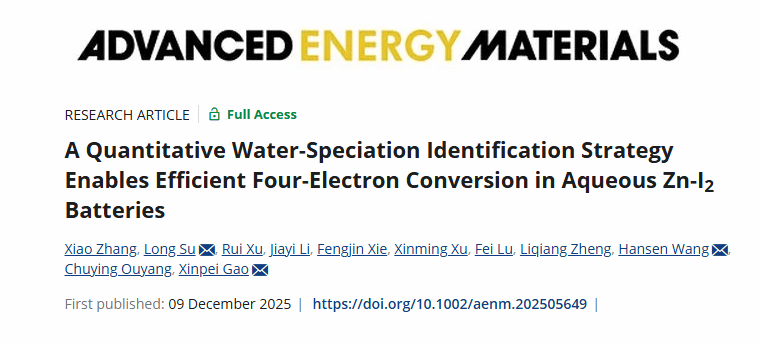 一区,IF=26)上发表题为“A quantitative Water-speciation Identification strategy Enables Efficient Four-Electron Conversion in Aqueous Zn-I2 Batteries”的研究论文。该研究通过对水环境的精确识别和调控,平衡了水对离子传输与四电子转化的影响,实现了高性能水系Zn-I2电池。