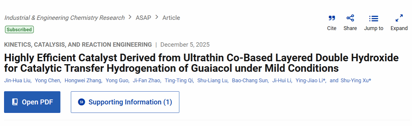 近日,化工三大刊之一 Industrial & Engineering Chemistry Research(IECR) 在线发表题为 “Highly Efficient Catalyst Derived from Ultrathin Co-Based Layered Double Hydroxide for Catalytic Transfer Hydrogenation of Guaiacol under Mild Conditions” 的研究论文。 搜同