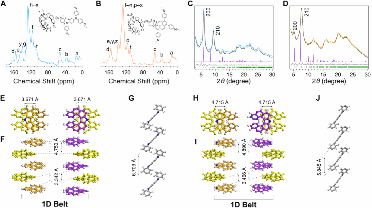 针对这一问题,团队设计合成了咔唑稠合[7]螺烯单体,该单体呈现V型几何结构,两个反应位点夹角104°、垂直间距4.4 Å,这种非常规结构本与传统一维框架生长模式不兼容。研究团队创新性地将其与四取代C₂对称π结单体(TPDA、PyTTA)缩合,得到了具有二重互穿结构的一维带状COFs,实现了拓扑禁阻结构的精准构筑,这也是首次发现一维COFs可形成互穿结构,打破了此前仅三维COFs存在互穿的认知,相关研究成果发表于国际顶级化学期刊《Journal of the American Chemical Society》。 搜同