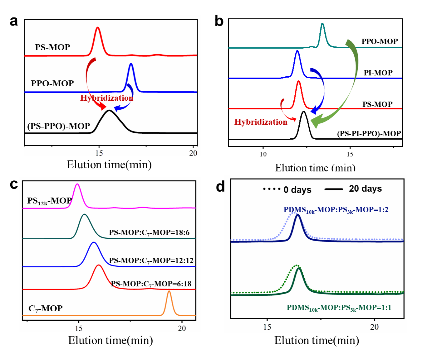在此研究基础上,进一步设计了MOP基MSPs的配体交换环境和条件,实现了热力学稳定状态的、不同组分的、不同比例的MSPs的制备。有趣的是,相比传统动力学控制的MSPs制备方法,通过配体交换所制备的MSPs具有超窄的分子量分布(PDI),这说明了所得的MSPs具有更理想的分子级共混特征。响应的分子结构演化过程,通过非接触式溶液SAXS和SANS测试技术得到较充分的论证。这种优异的热力学结构稳定性,使得材料在服役环境下表现出稳定的物理化学性质。