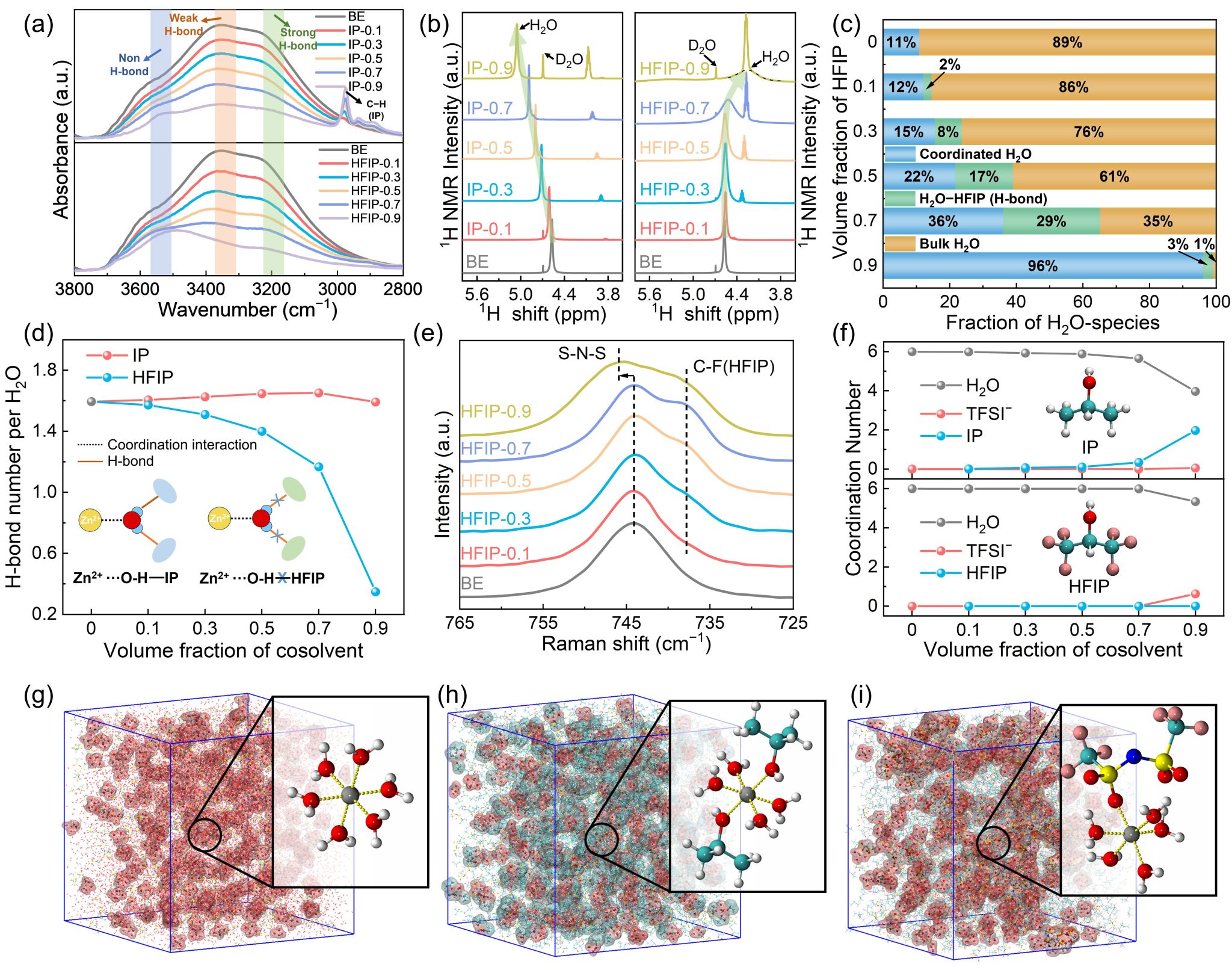 高新培教授和宁德时代21C实验室欧阳楚英教授合作提出了引入潜溶剂来构建含阴离子的溶剂化结构的策略,以提高水系锌电池中锌负极的稳定性。通过理论计算辅助,在多种溶剂中筛选到了六氟异丙醇(HFIP)作为调控电解液微观结构的理想潜溶剂。HFIP具有亲阴离子和疏阳离子的特性,当HFIP与Zn(TFSI)2、H2O构筑三组分电解液时,Zn(TFSI)2盐就具有了典型的双亲性特点,Zn2+阳离子亲水而TFSI−阴离子亲HFIP。在该双亲性特点的作用下,Zn(TFSI)2盐在水中的溶解度由5.4 M增加至20.6 M。盐浓度的提升使得阴离子进入锌离子溶剂化结构成为可能,并诱导其在循环过程中优先分解,在锌负极表面形成了阴离子衍生的固体电解质层。此外,阴离子与阳离子的直接相互作用还改变了锌离子的脱溶剂化路径,实现了还原过程的逐步脱水,这极大的减少了锌负极对水的吸附,进一步抑制了副反应的发生。因此,阴离子衍生的固体电解质层和优化的脱溶剂化路径协同作用,实现了锌的均匀沉积,并提高了电极的循环可逆性。当与NaV3O8-1.5H2O(NVO)正极结合使用时,所组装的全电池在1 A g-1的条件下经过2000次循环后可达到87.8%的高容量保持率,证明了潜溶剂策略在电解液优化方面的潜力。该成果以“Latent Solvent Induced Reliable Interfacial Chemistry Toward Highly Reversible Zn Anodes”为题在国际知名期刊Advanced Energy Materials上发表。