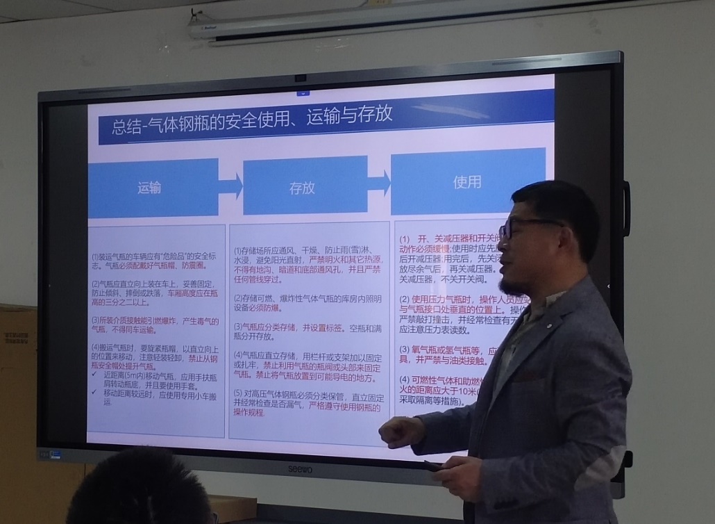 实验室气体使用和管理培训部分由江苏君源环保科技有限公司陈坚老师主讲,陈坚老师详细讲解了实验室气体种类性质、气瓶的安全标准及安全使用、运输与存放等,并列举了近年来实验室气体安全事故案例。